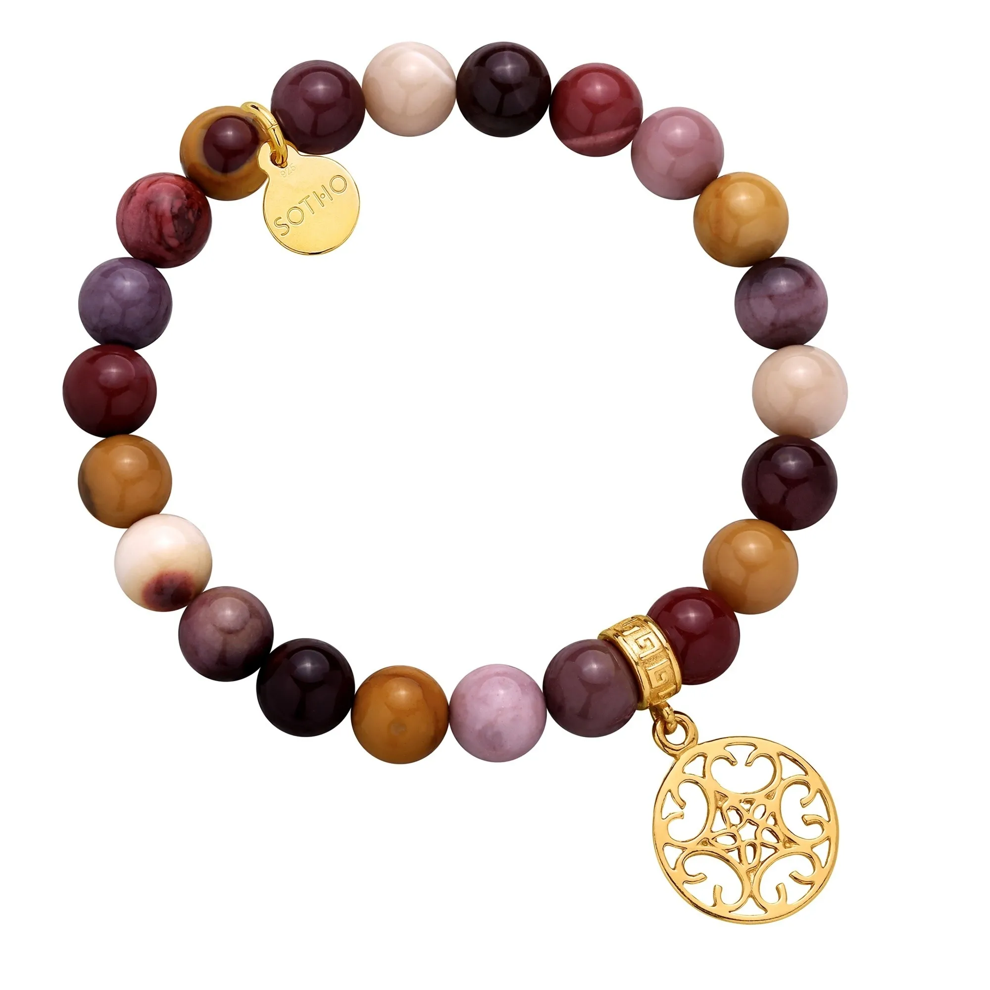 Bransoletka wykonana z mokaitu, zdobiona orientalną rozetką i zawieszką z logo marki. Wszystkie elementy wykonane ze srebra 925.