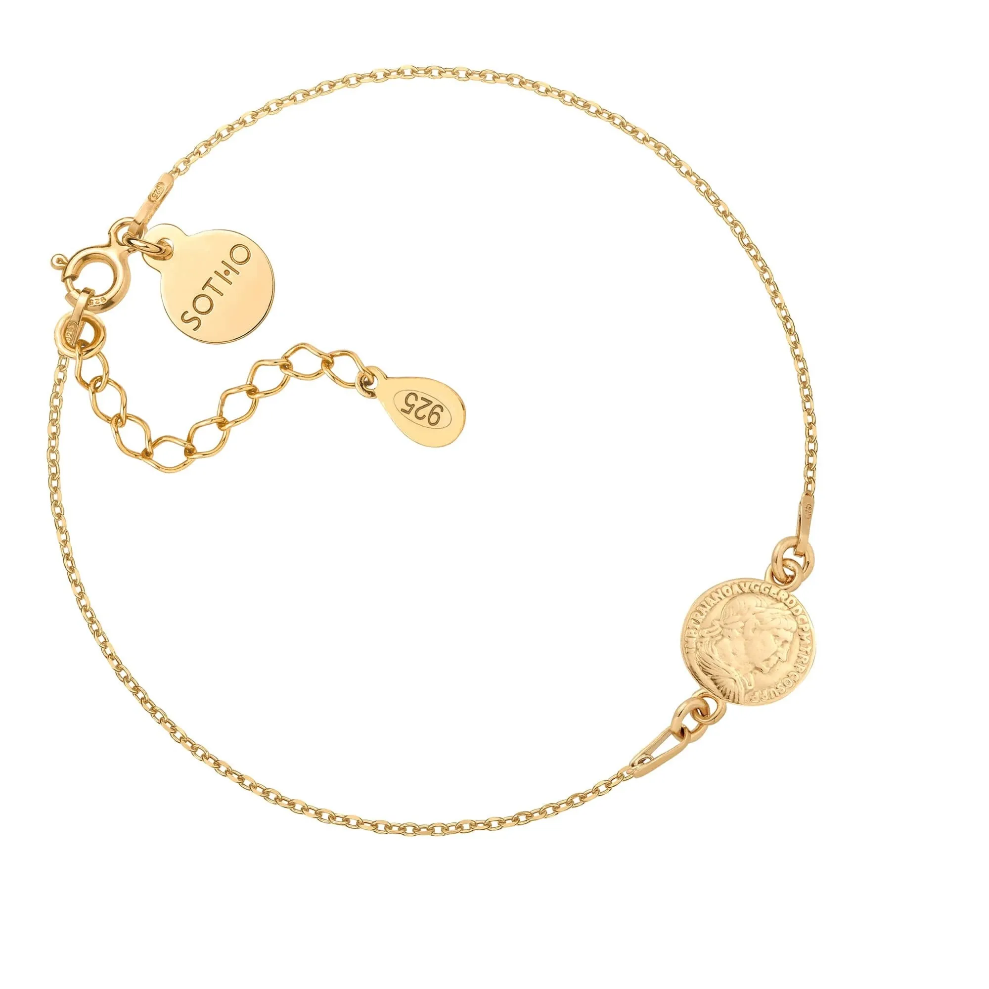 Złota bransoletka łańcuszkowa zdobiona monetą i zawieszką z logo marki. Całość wykonana ze srebra 925 powlekanego 24 karatowym różowym złotem. Długość bransoletki ok. 16 cm Długość bransoletki z przedłużką ok. 20 cm Przedłużka 4 cm Grubość łańcuszka 1 mm Medalion 12 x 7 mm Zawieszka z logo 10 mm Produkt o wadze poniżej 5 g. Zapakowany w eleganckie pudełeczko z logo marki. Posiada logowaną metkę. Istnieje możliwość zamówienia bransoletki innej długości, z innym modelem zawieszki, z kilkoma zawieszkami, na innym modelu łańcuszka, w wersji ze srebra 925 lub srebra 925 powlekanego 24 karatowym żółtym złotem, z dodatkowymi kamieniami, perłami lub kryształami SWAROVSKI® CRYSTAL itp.