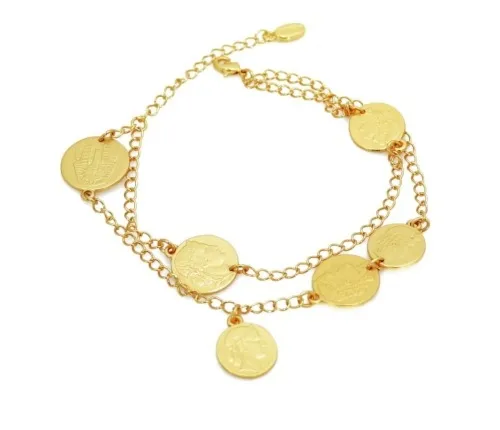 Bransoletka z monetkami na grubym łańcuszku. Stal szlachetna pozłacana. Gwarancja pozłocenia i jakości. Warstwa złota naniesiona w metodzie – PVD- napylanie próżniowe jonami tytanu, czy też azotkiem tytanu jest nowoczesną metodą nanoszenia powłok o bardzo dużej trwałości. * Pokryte jest w całości 4 – 8 mikronową warstwą 14K, 18K i 24K złota. * Warstwa złocenia pokryta jest lakierem jubilerskim, który zabezpiecza powłokę złota przed ścieraniem i nadaje wspaniały połysk * Biżuteria wykonana ze stali szlachetnej-należy do grupy stali o strukturze austenitycznej ( podobna chirurgiczna 316 L) : – jest hipoalergiczna i nie uczula, ponieważ nie emituje związków niklu do organizmu – nie koroduje, nie odbarwia się i długo cieszy swoim blaskiem – ścieralność uzależniona od noszenia i od pH ciała – nie wymaga specjalnej konserwacji jak biżuteria ze srebra, czy złota Ze względu na różne ustawienia monitorów oraz różną jakość wyświetlaczy zastosowanych w urządzeniach mobilnych, kolory przedstawione na zdjęciach mogą nieznacznie różnić się od rzeczywistych.