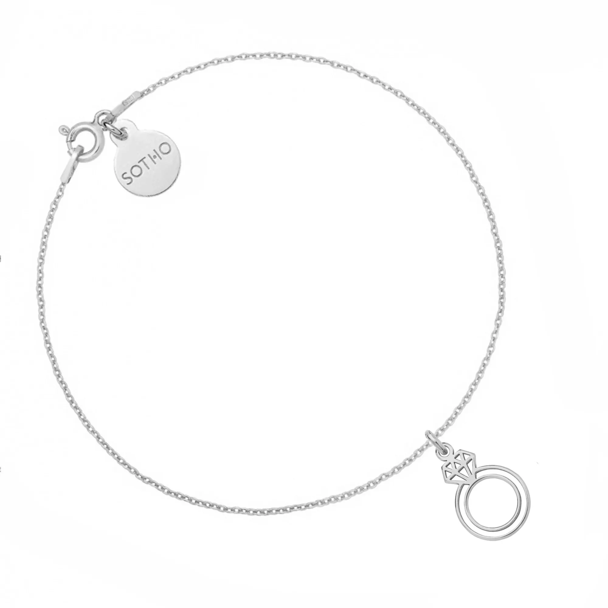 Złota bransoletka łańcuszkowa zdobiona pierścionkiem i zawieszką z logo marki. Całość wykonana ze srebra 925 powlekanego 24 karatowym różowym złotem.