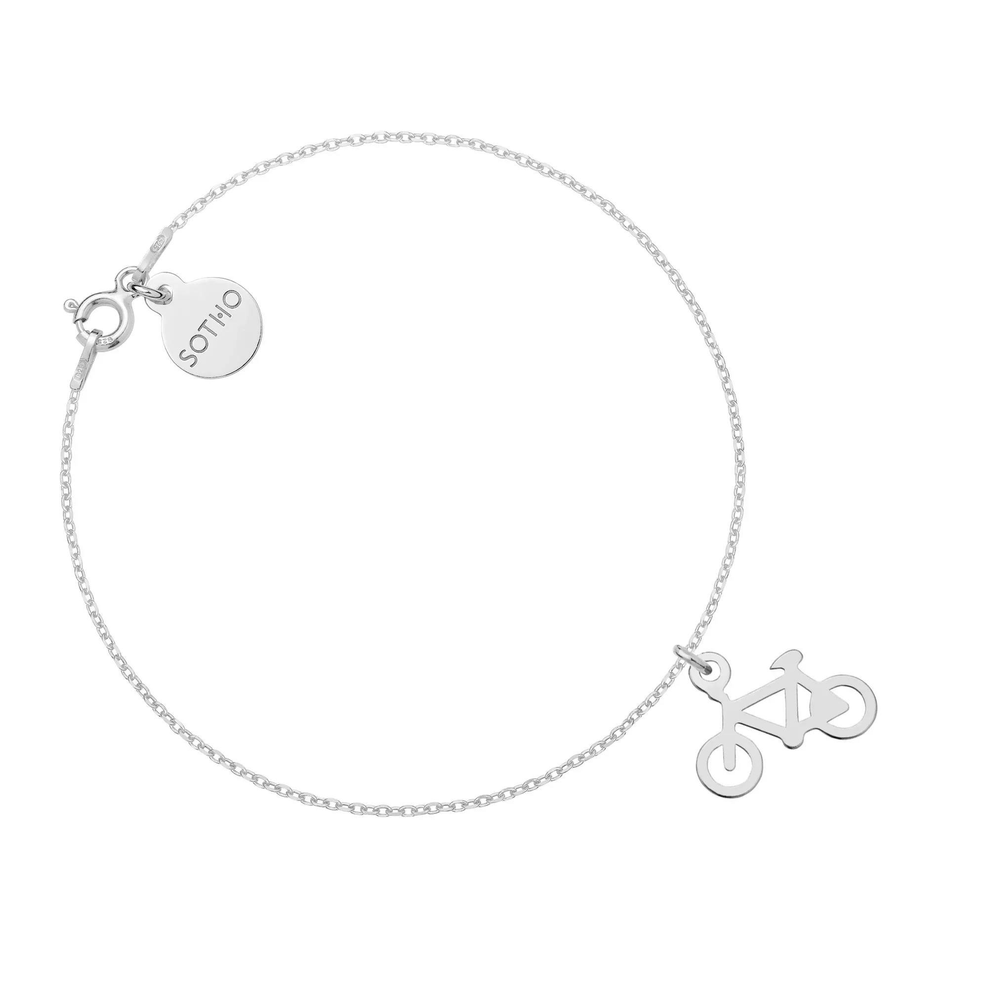 Złota bransoletka łańcuszkowa zdobiona rowerem i zawieszką z logo marki. Całość wykonana ze srebra 925 powlekanego 24 karatowym różowym złotem.