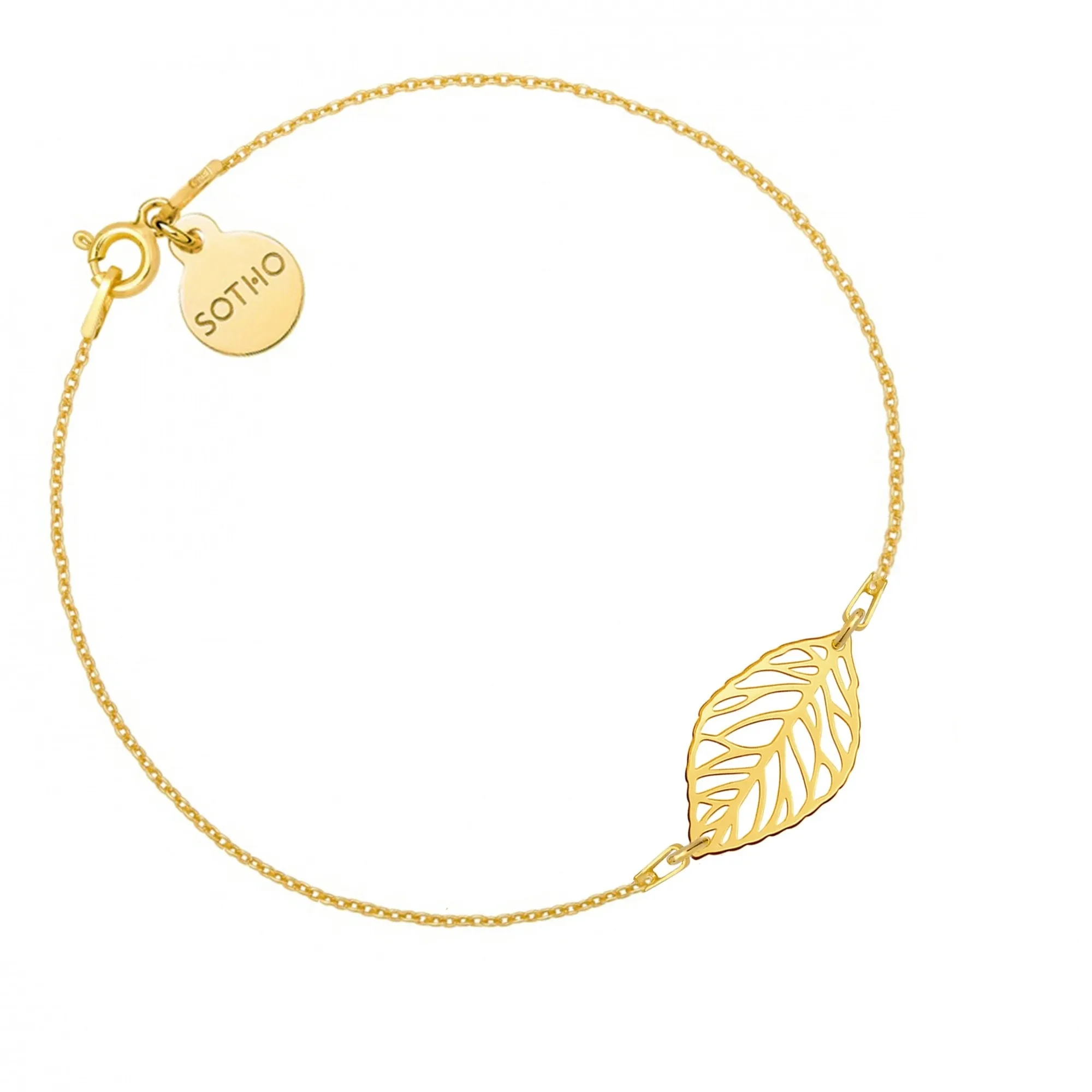 Złota bransoletka łańcuszkowa zdobiona ażurowym listkiem i zawieszką z logo marki. Całość wykonana ze srebra 925 powlekanego 24 karatowym różowym złotem.
