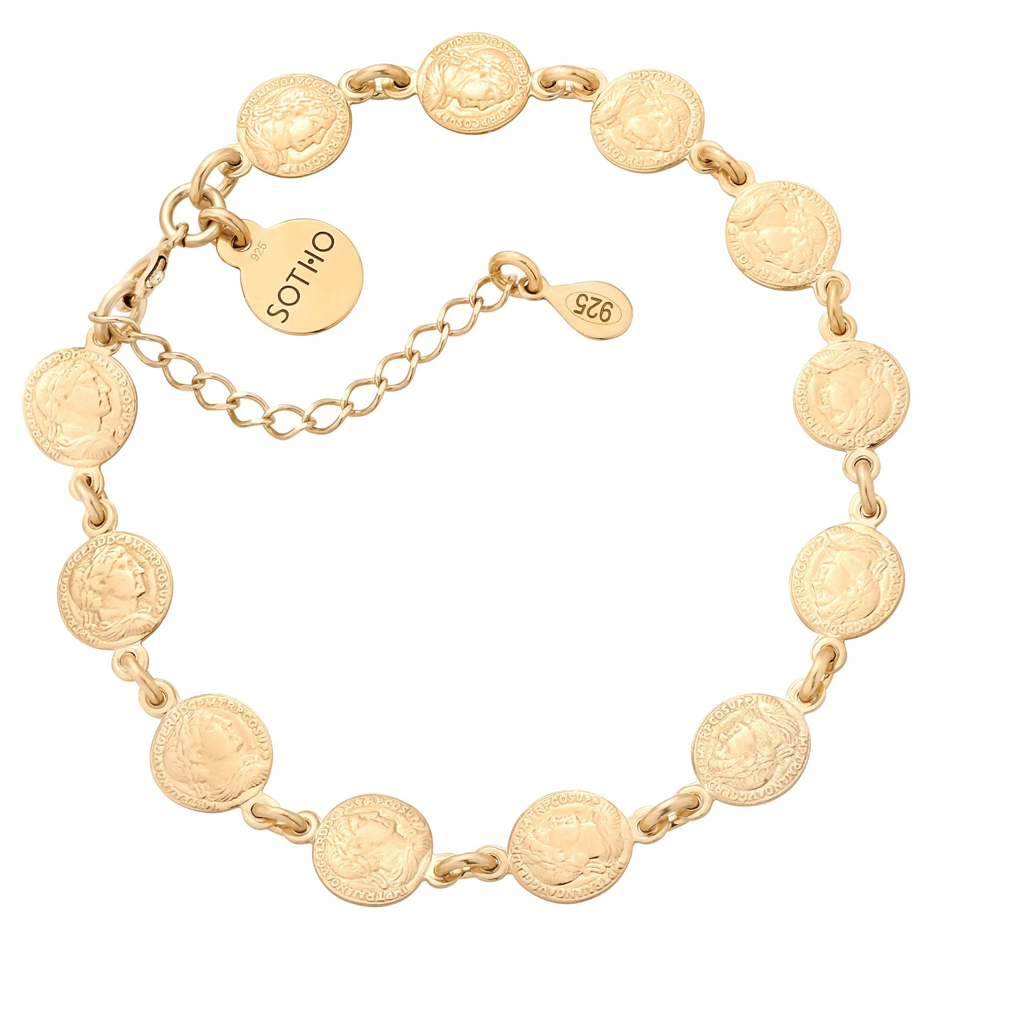 Złota bransoletka zdobiona monetkami i zawieszką z logo marki. Całość wykonana ze srebra 925 powlekanego 24 karatowym różowym złotem. Długość bransoletki ok. 18 cm Długość bransoletki z przedłużką ok. 22 cm Przedłużka 4 cm Grubość łańcuszka 1 mm Moneta 12 x 7 mm Zawieszka z logo 10 mm Produkt o wadze poniżej 5 g. Zapakowany w eleganckie pudełeczko z logo marki. Posiada logowaną metkę. Istnieje możliwość zamówienia bransoletki innej długości, z innym modelem zawieszki, z kilkoma zawieszkami, na innym modelu łańcuszka, w wersji ze srebra 925 lub srebra 925 powlekanego 24 karatowym żółtym złotem, z dodatkowymi kamieniami, perłami lub kryształami SWAROVSKI® CRYSTAL itp.
