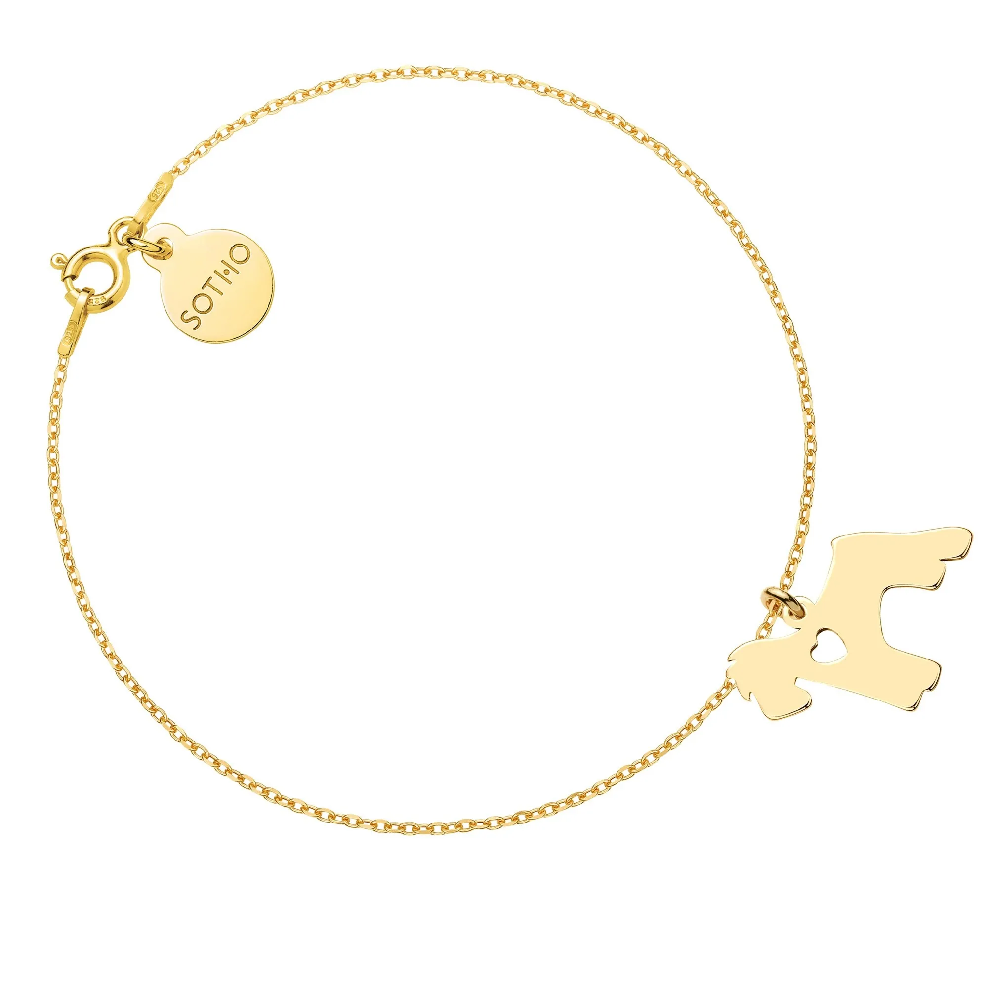 Złota bransoletka łańcuszkowa zdobiona zawieszką z psem rasy sznaucer i zawieszką z logo marki. Całość wykonana ze srebra 925 powlekanego 24 karatowym różowym złotem. Długość bransoletki 18 cm. Grubość łańcuszka 1 mm. Pies 16 x 16,1 mm. Zawieszka z logo 10 mm. Produkt o wadze poniżej 5 g. Zapakowany w eleganckie pudełeczko z logo marki. Posiada logowaną metkę. Istnieje możliwość zamówienia bransoletki innej długości, z innym modelem zawieszki, z kilkoma zawieszkami, na innym modelu łańcuszka, w wersji ze srebra 925 lub srebra 925 powlekanego 24 karatowym żółtym złotem itp.