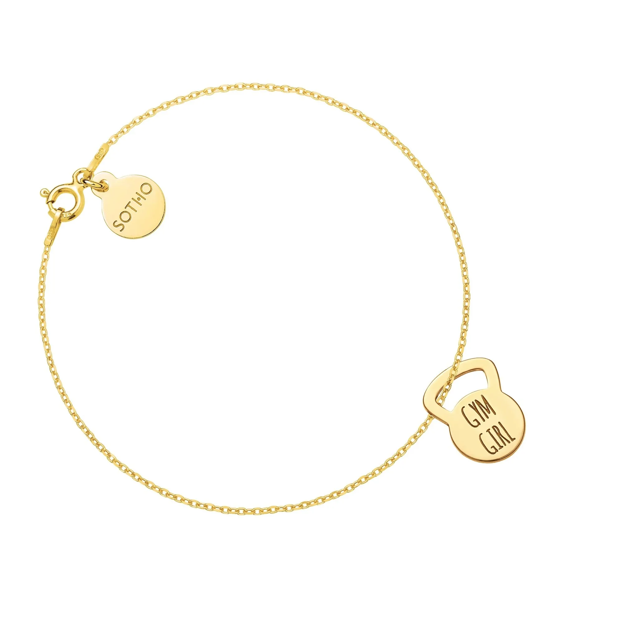 Złota bransoletka łańcuszkowa zdobiona ciężarkiem kettlebellem i zawieszką z logo marki. Całość wykonana ze srebra 925 powlekanego 24 karatowym różowym złotem. Na ciężarku znajduje się grawerunek z motywującym przesłaniem GYM GIRL.