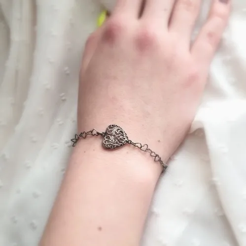 Bransoletka srebrna z sercami – subtelny symbol miłości Ta wyjątkowa bransoletka srebrna to doskonały wybór dla osób ceniących piękno i symbolikę. Osiem ażurowych serduszek, połączonych delikatnymi ogniwkami, tworzy harmonijną kompozycję, która subtelnie wyraża emocje. Każde serduszko o szerokości 1,6 cm zostało wykonane z najwyższą precyzją, dzięki czemu bransoletka zachwyca lekkością i finezją. Długość 17 cm z możliwością przedłużenia o dodatkowe 3 cm za pomocą łańcuszka sprawia, że bransoletka idealnie dopasuje się do każdego nadgarstka, zapewniając wygodę noszenia. Oksydowane wykończenie nadaje jej elegancki, szary odcień, który podkreśla niepowtarzalny charakter biżuterii i doskonale komponuje się z każdą stylizacją – od codziennej po wieczorową. Dzięki swojej wadze 10,2 g, bransoletka jest lekka, a jednocześnie solidna, co czyni ją nie tylko pięknym, ale i praktycznym dodatkiem. Dlaczego warto wybrać tę bransoletkę?