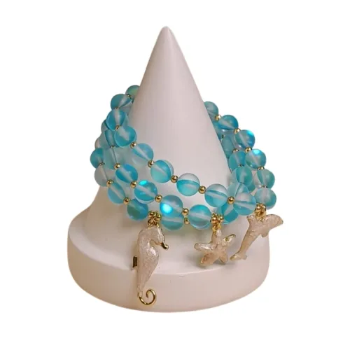 Delikatna, a zarazem pełna charakteru bransoletka została wykonana z naturalnych turkusów i ozdobiona ręcznie malowanymi kwiatuszkami w odcieniach błękitu. Każdy detal został starannie dopracowany, a subtelne kryształki dodają całości eleganckiego blasku.