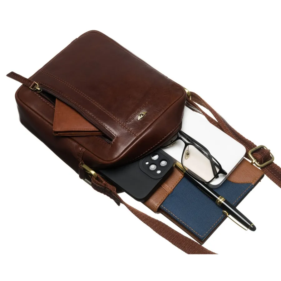 Skórzana listonoszka męska w brązowym kolorze, zamykana na złoty suwak w zestawie z saszetką PTN 704E-OPU Peterson