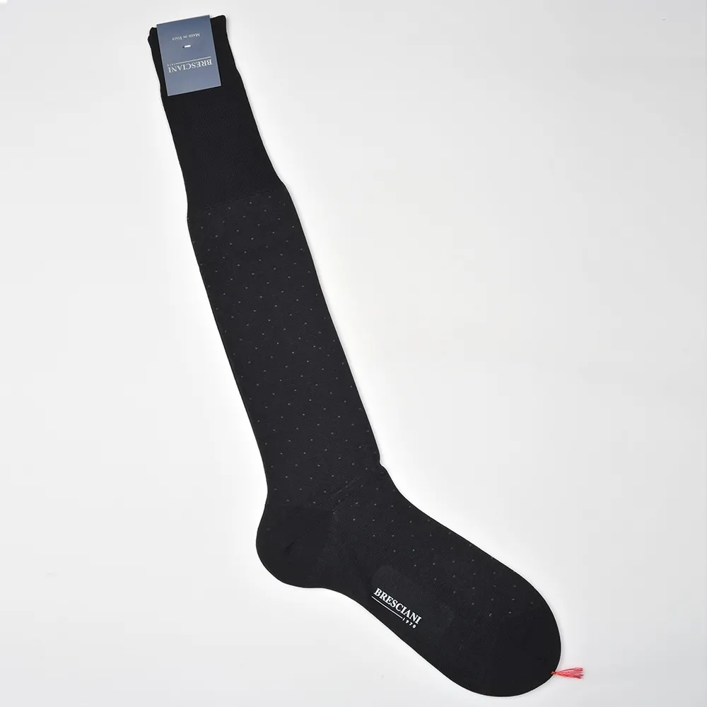 Granatowe skarpetki Bresciani w niebieskie kwadraty. Skarpetki Bresciani są wykonane z najlepszej dostępnej egipskiej bawełny Mako. Bawełna jest lekka i idealna od wiosny do jesieni i dla osób, które nie lubią przegrzewać stóp. Część palcowa ze stopą są ręcznie łączone aby idealnie pasowały do stopy i wyjątkowo komfortowo się nosiły. Skarpetki wykonane są w 100% z egipskiej bawełny. Przy wyborze rozmiaru warto wybrać skarpetki o 1 rozmiar mniejsze.