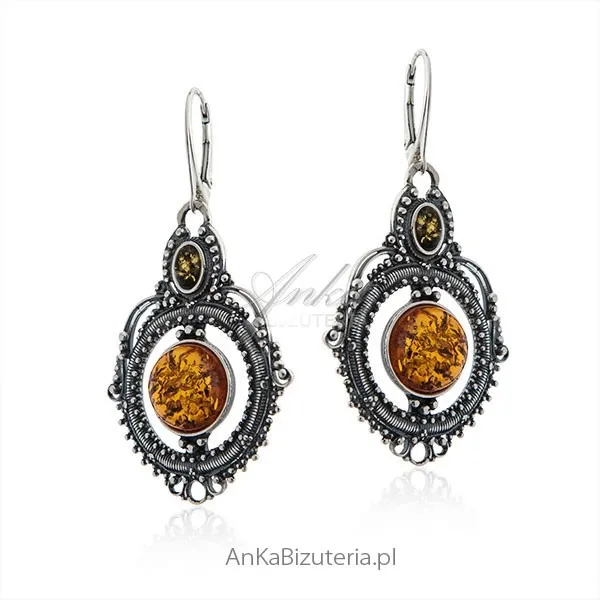 Oryginalne kolczyki srebrne z bursztynem - orientalna biżuteria z bursztynem