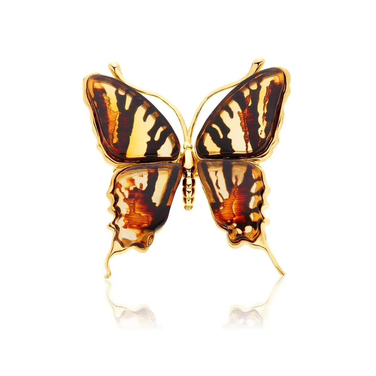 Broszka srebrna pozłacana motyl z bursztynem Big Butterfly Touch