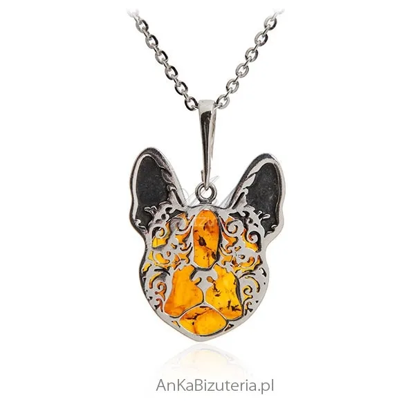 Zawieszka srebrna pies z bursztynem buldog francuski
