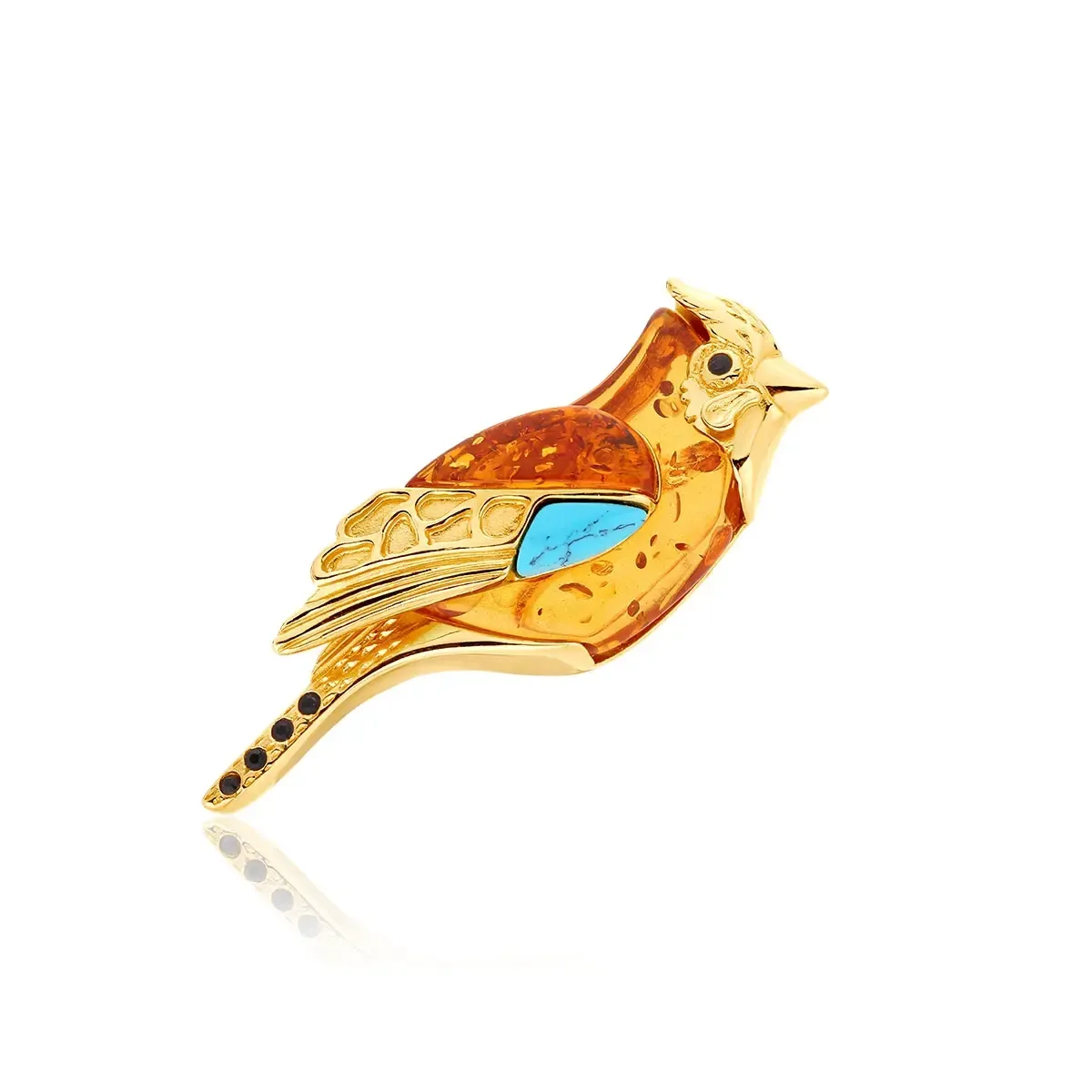 Broszka srebrna pozłacana ptak sójka z bursztynem Jaybird