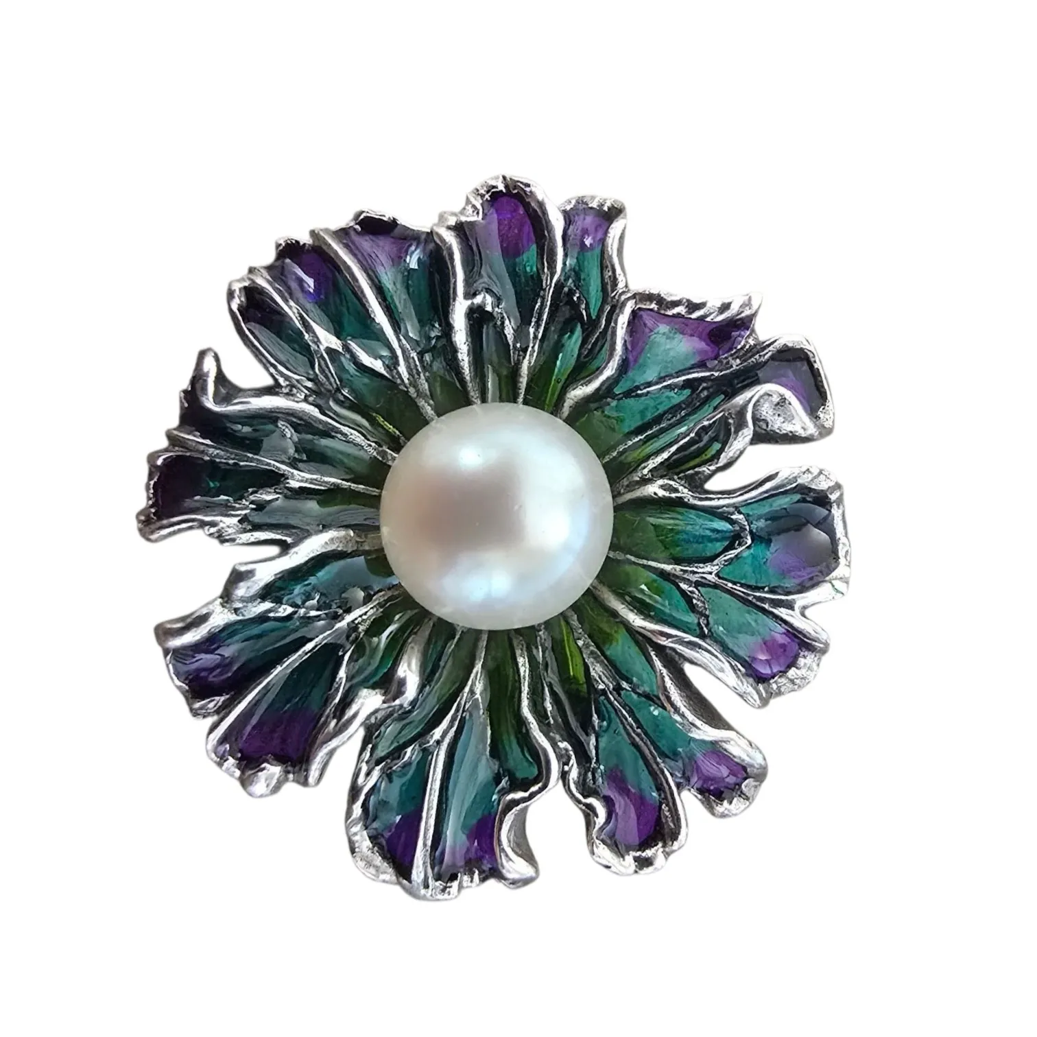 Broszko-wisior srebrny kwiat z perłą na zielono-fioletowej emalii