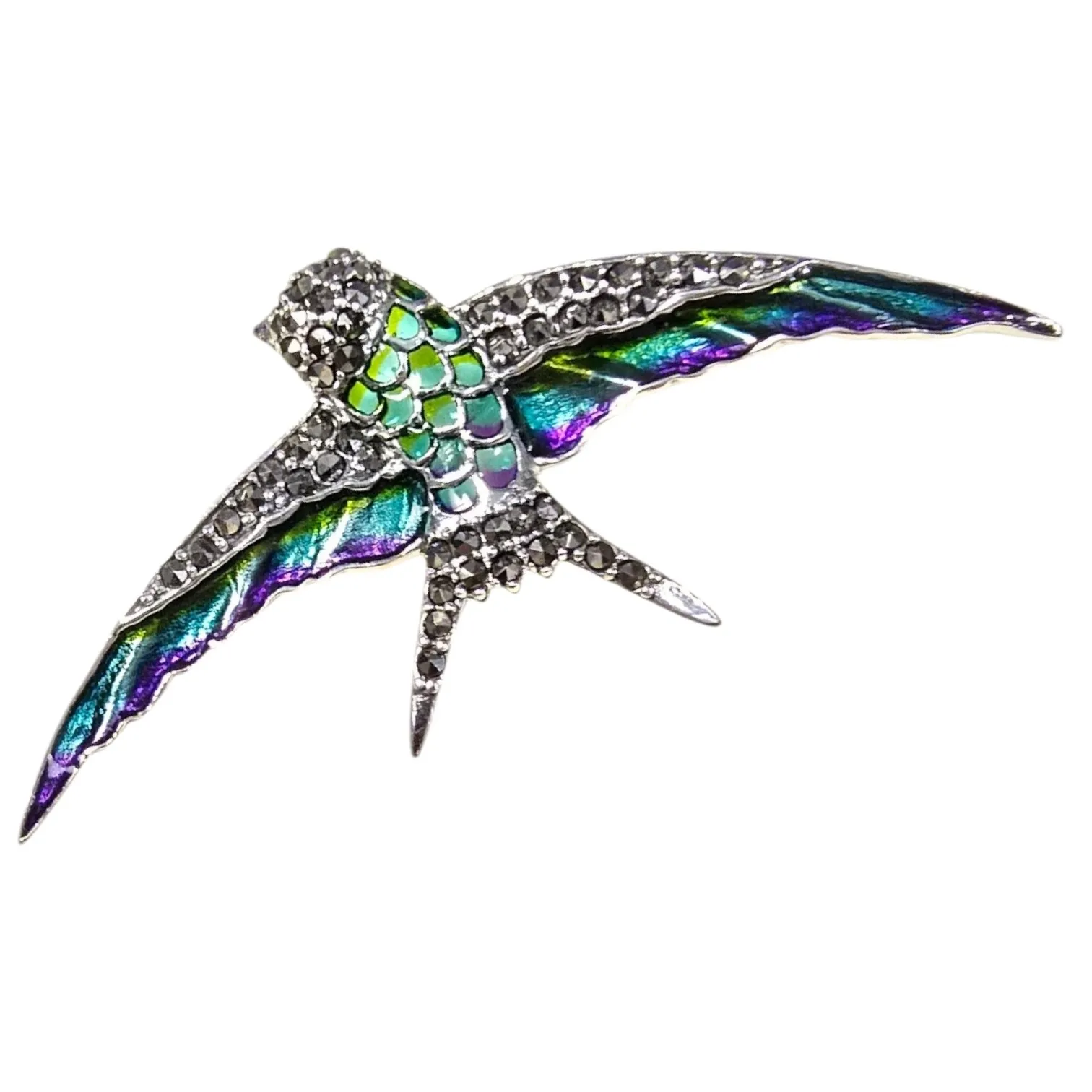 Broszka srebrna z markazytami i zielono-fioletową emalią jaskółka