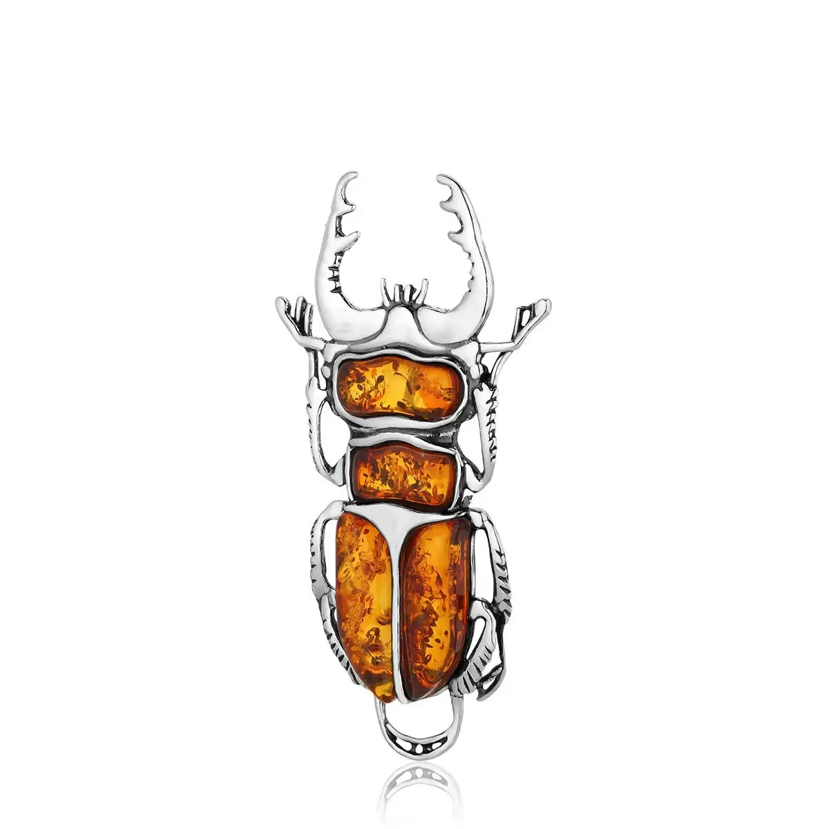 Broszka srebrna żuk jelonek z zielonym bursztynem