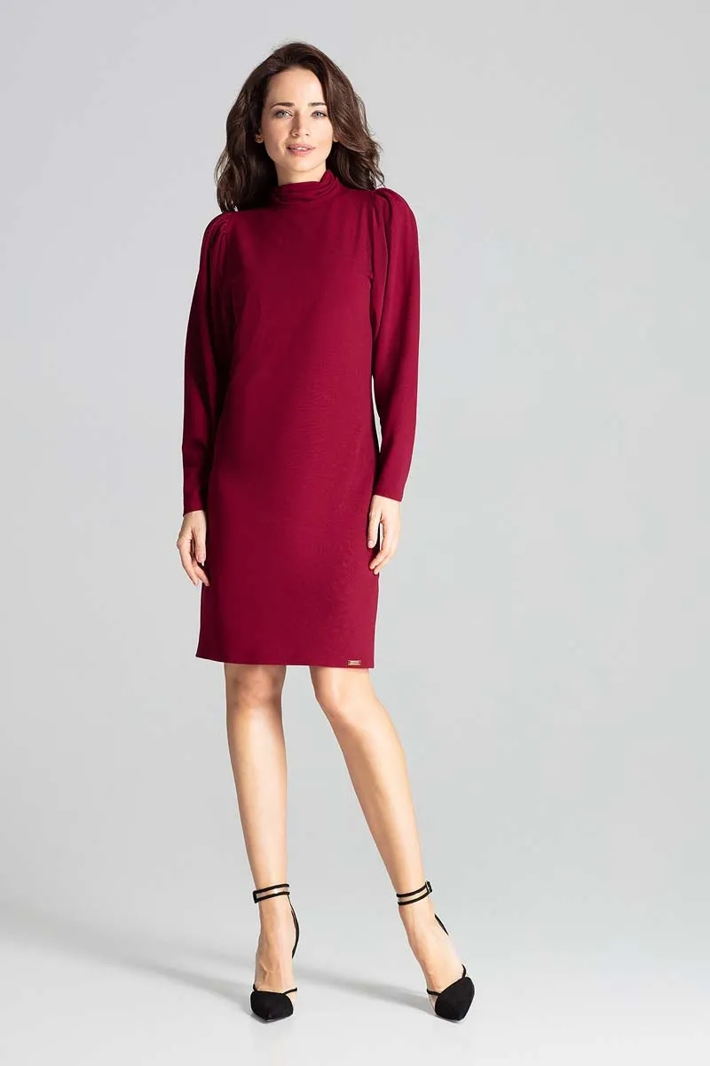 Bordowa Dopasowana Sukienka z Długim Bufiastym Rękawem