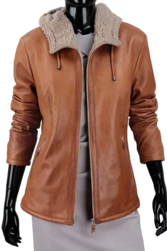 ALA084 - ocieplana kożuchem kurtka skórzana damska z kapturem DORJAN