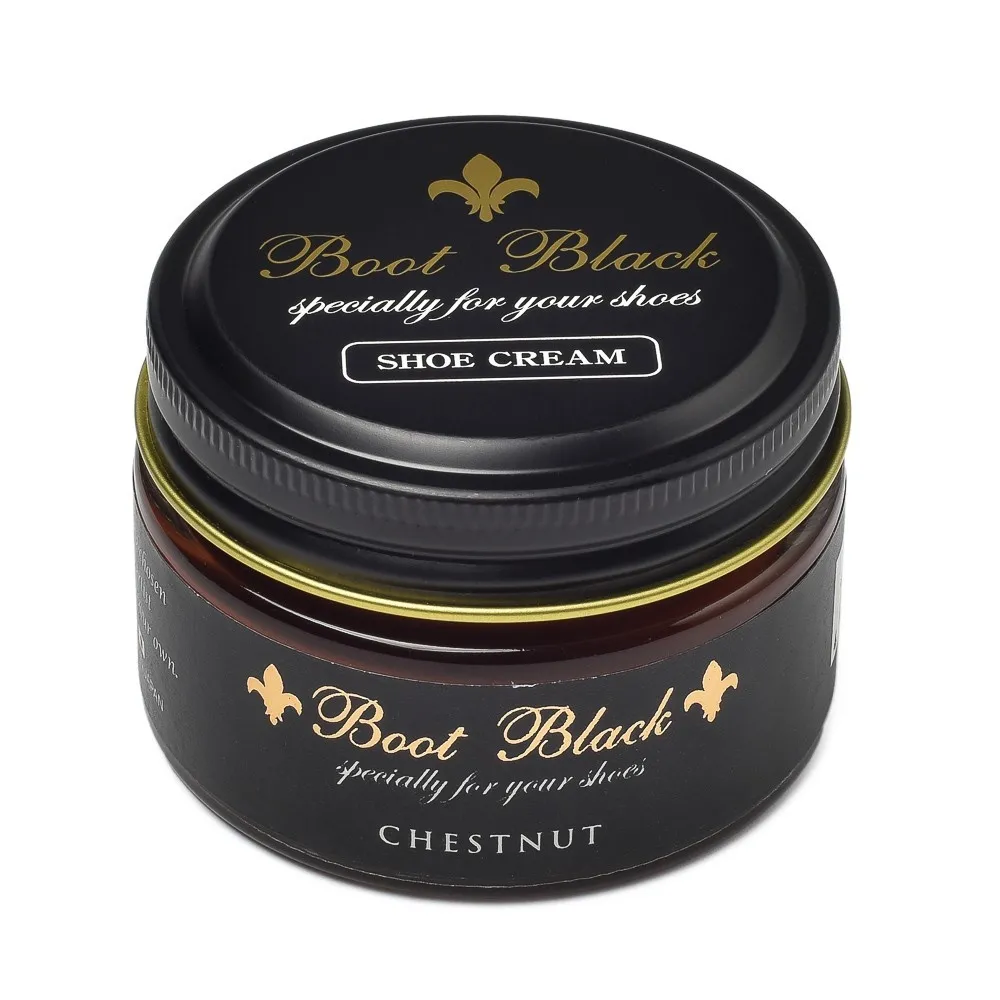 Burgundowy krem do pielęgnacji obuwia. Krem marki premium Black Boot produkowany w Japonii. Ten krem to emulsja stworzona z wysokiej jakości wosku zapewniającego kolor i głęboki połysk. Służy do pielęgnacji i impregnacji obuwia. Utrzymuje skórę butów w bardzo dobrej kondycji. Ten produkt ma bordowy, burgundowy kolor. Przeznaczony jest do skóry gładkiej. Pojemność opakowania: 55g Zastosowanie: Na początku należy przetrzeć buty szczotką oraz usunąć brud wokoło podeszwy. Następnie suchą szmatką nałożyć krem do butów. Po tym etapie, należy dalej ponownie przetrzeć buty czystą szczotką oraz wypolerować buty po wyschnięciu kremu.