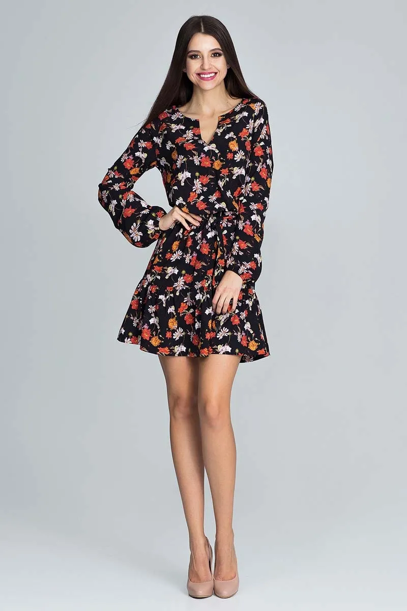 Zwiewna Wzorzysta Sukienka z Bufiastym Rękawem z Paskiem - Wzór 82