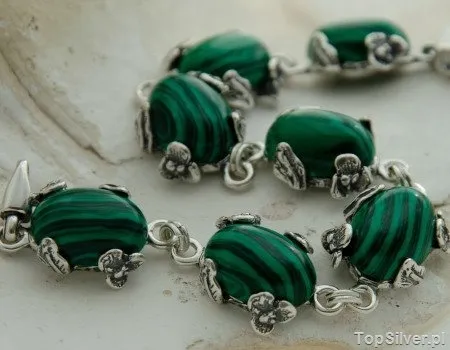 Dlaczego by nie sprawić sobie bizuterii z polskim diamentem? Kamień, ktory uwielbiły sobie gwazdy. Taki który jest na świecie niezwykle rzadki będzie idelanym uwieńczeniem srebrnej biżuterii. Przedstawiamy Państwu piękną srebrną bransoletkę, w której oksydowane ramki, inspirowane motywami roślinnymi oprawione zostały okazałe naturalne krzemienie pasiaste. Bransoletka składa się z siedmiu elementów. Długość bransolety to ok 18cm. Szerokość bransolety 1,3cm. Wymiar kamienia to 14 x 10mm Srebro próby 925. Krzemienie pasiaste mogą nieco różnić się wybrawieniem od prezentowanych na foto. W naszej ofercie znajdują się także kolczyki, wisiorek oraz pierscionek do kompletu. Kupując komplet oszczedzasz!