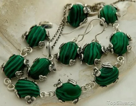 Dlaczego by nie sprawić sobie bizuterii z polskim diamentem. Kamień ktory uwielbiły sobie gwazdy. Taki który jest na świecie niezwykle rzadki będzie idelanym uwieńczeniem srebrnej biżuterii. Przedstawiamy Państwu inspirowany motywami roślinnymi srebrne zestaw bizuterii. W którym zakute zostały olbrzymie naturalne krzemienie pasiaste. W skład takiego zestawu wchodzą: bransoletka, kolczyki, wisior oraz pierścionek. Wymiary pojedyńczego ogniwa to: 13mm x 14mm Wymiar kamienia to: 10mm x 14mm. Długość bransoletki ok 18cm. Długość kolczyków z zapięciem 2,8cm. Długość wisiorka z zawieszką 2,5cm. Srebro próby 925.