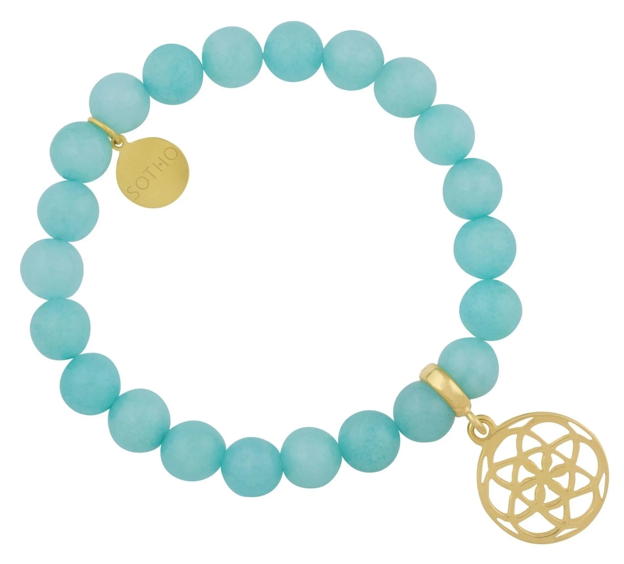 Bransoletka wykonana z cielistego kamienia słonecznego, kotka i zawieszki z logo marki. Wszystkie elementy wykonane ze srebra 925 powlekanego 24 karatowym różowym złotem.