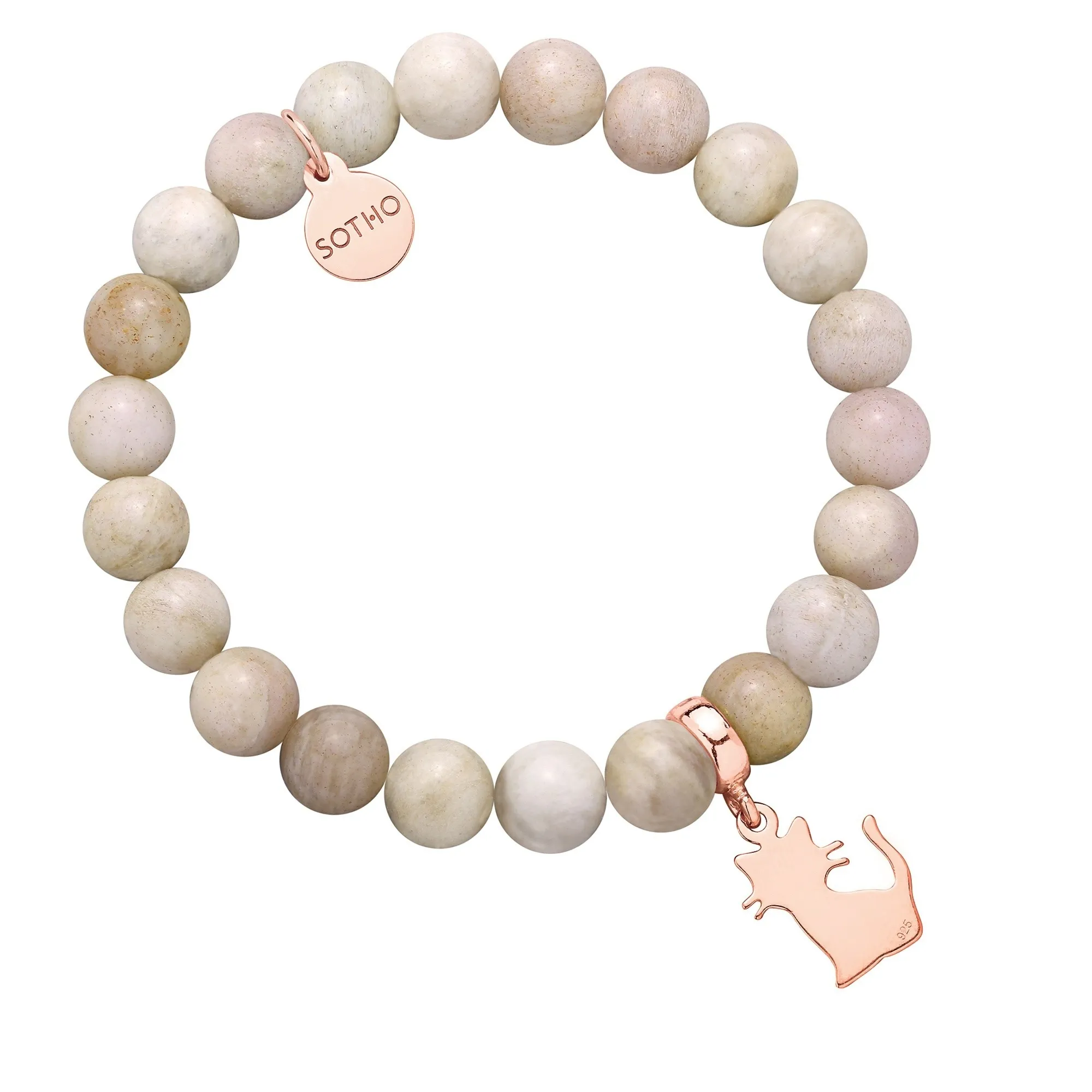 Bransoletka wykonana z cielistego kamienia słonecznego, kotka i zawieszki z logo marki. Wszystkie elementy wykonane ze srebra 925.