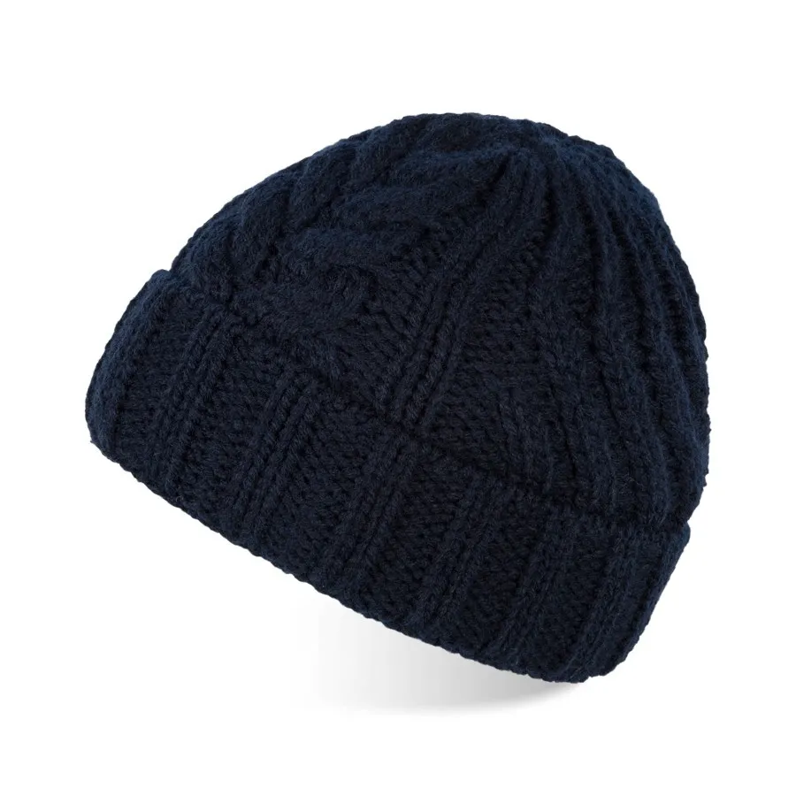 Beżowa czapka damska PaMaMi w warkocze z futerkowym pomponem. Polarowe podszycie zapewnia ciepło.
