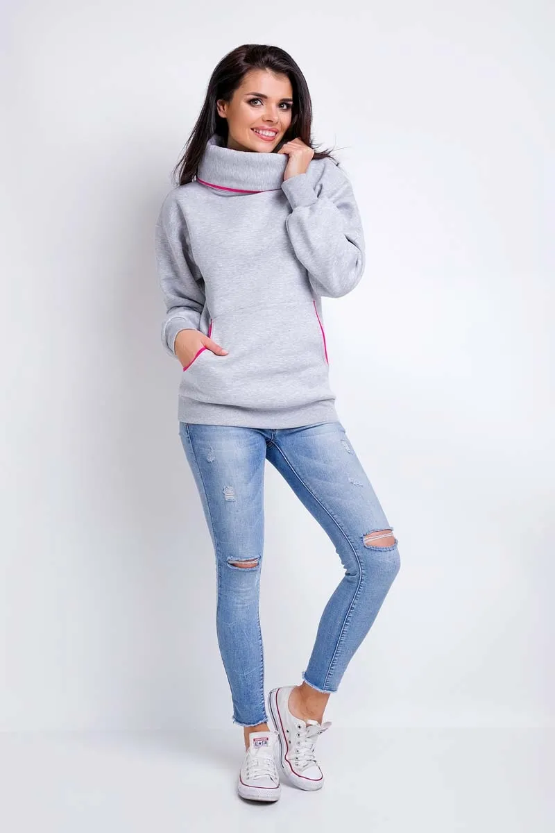 Szara Oversizowa Bluza z Kapturem Wykończona Falbanką