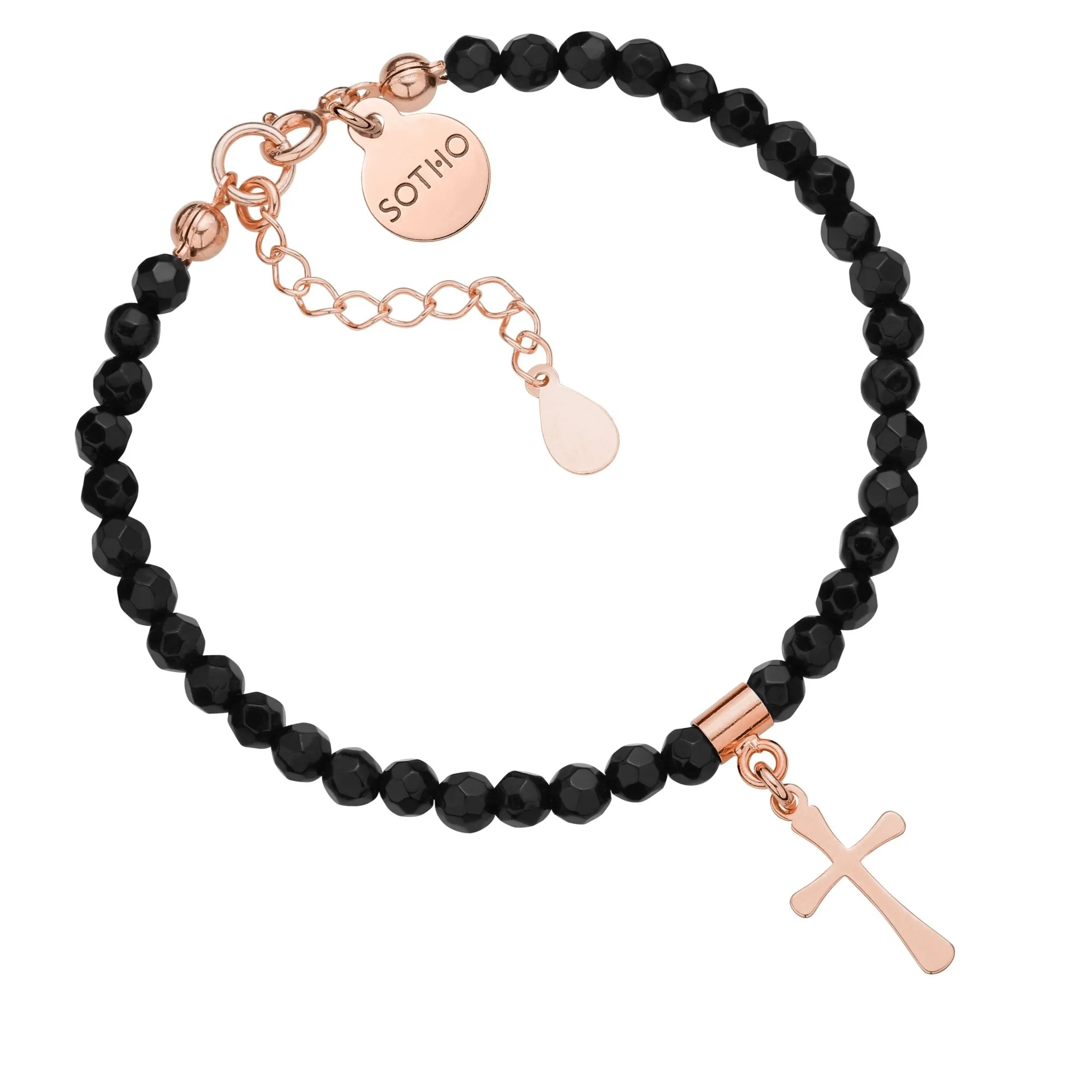 Czarna bransoletka z fasetowanego onyksu z krzyżykiem z różowego złota