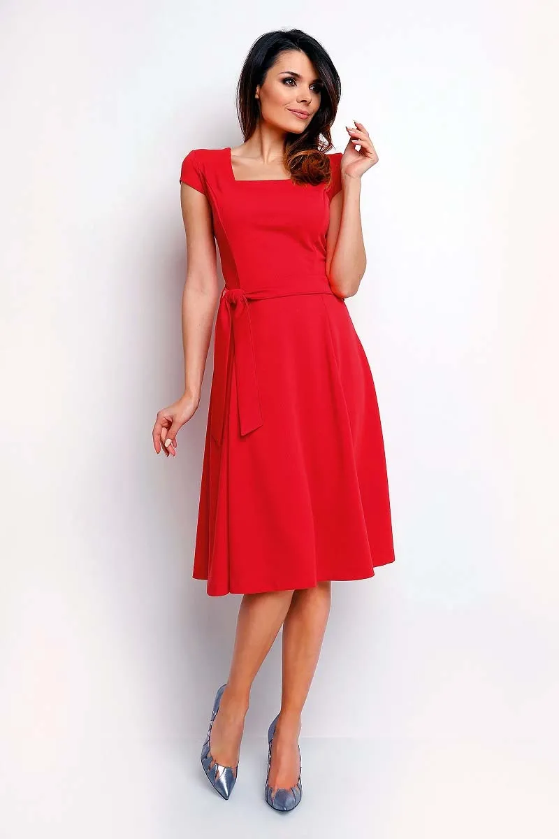 Czerwona Wyjściowa Rozkloszowana Sukienka z Dekoltem Karo