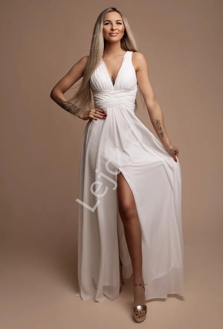 Elegancka Francuska biała kopertowa sukienka z szyfony z przeplatanym pasem 1508