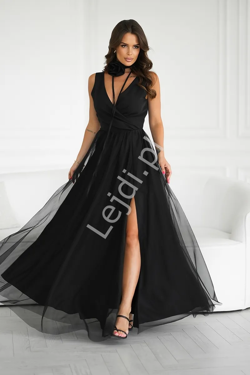 Czarna suknia wieczorowa z tiulową spódnicą HB318