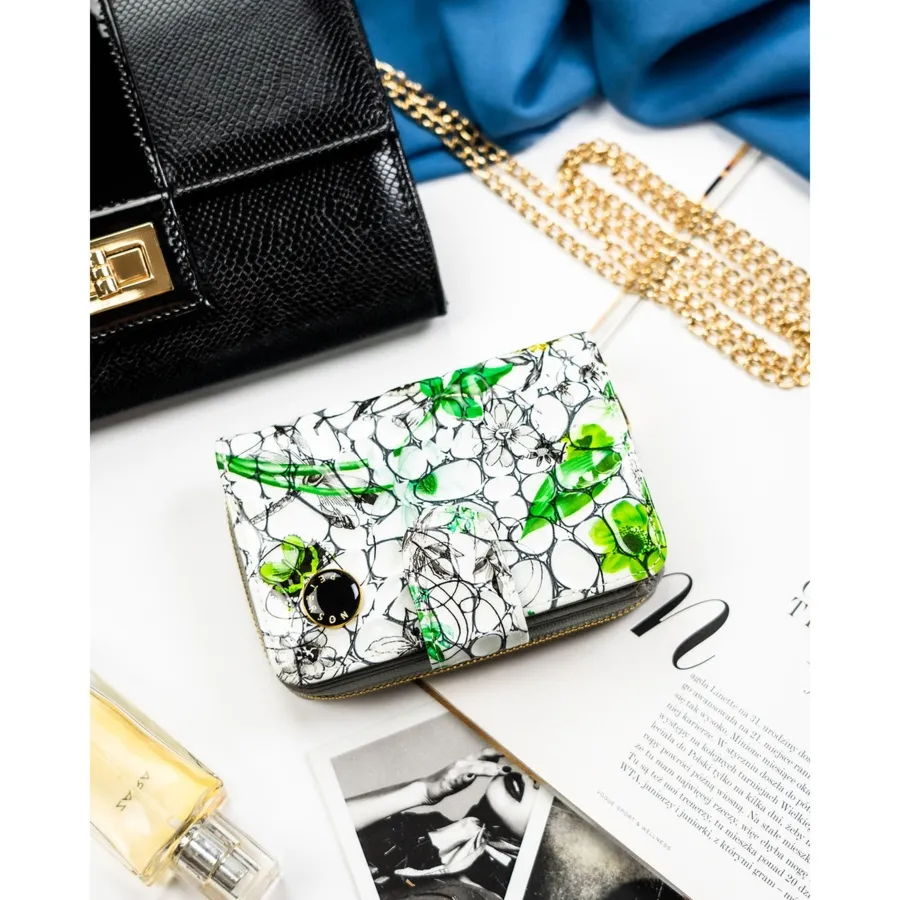 Zielony portfel damski ze skóry naturalnej z systemem RFID ozdobiony kwiatowym wzorem PTN PH30-LFL Peterson