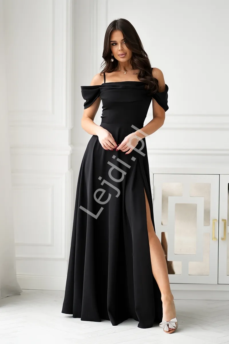 Czarna długa połyskliwa suknia wieczorowa typu hiszpanka z rozporkiem na nodze hb320