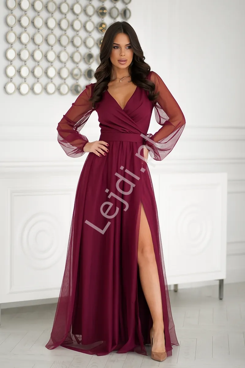 Wyszczuplająca brązowa sukienka na wesele, na studniówkę, na bal. Modna sukienka tiulowa z kopertowym dekoltem. Stylowa sukienka z miękkiego tiulu. Wspaniale wykonana sukienka wieczorowa, szyta w Polsce.