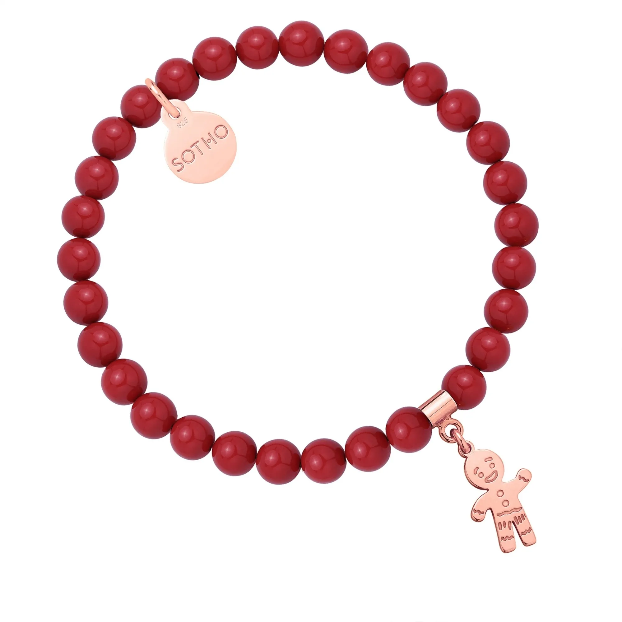 Bransoletka wykonana z pereł SWAROVSKI® CRYSTAL w kolorze czerwonym Red Coral, zdobiona Ciastkiem i zawieszką z logo marki. Wszystkie elementy wykonane ze srebra 925 powlekanego 24 karatowym żółtym złotem.