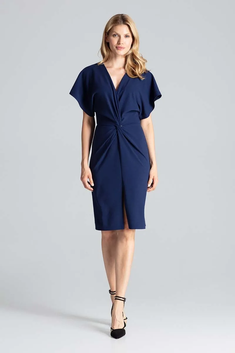 Granatowa Elegancka Sukienka Midi z Zakładanym Dekoltem