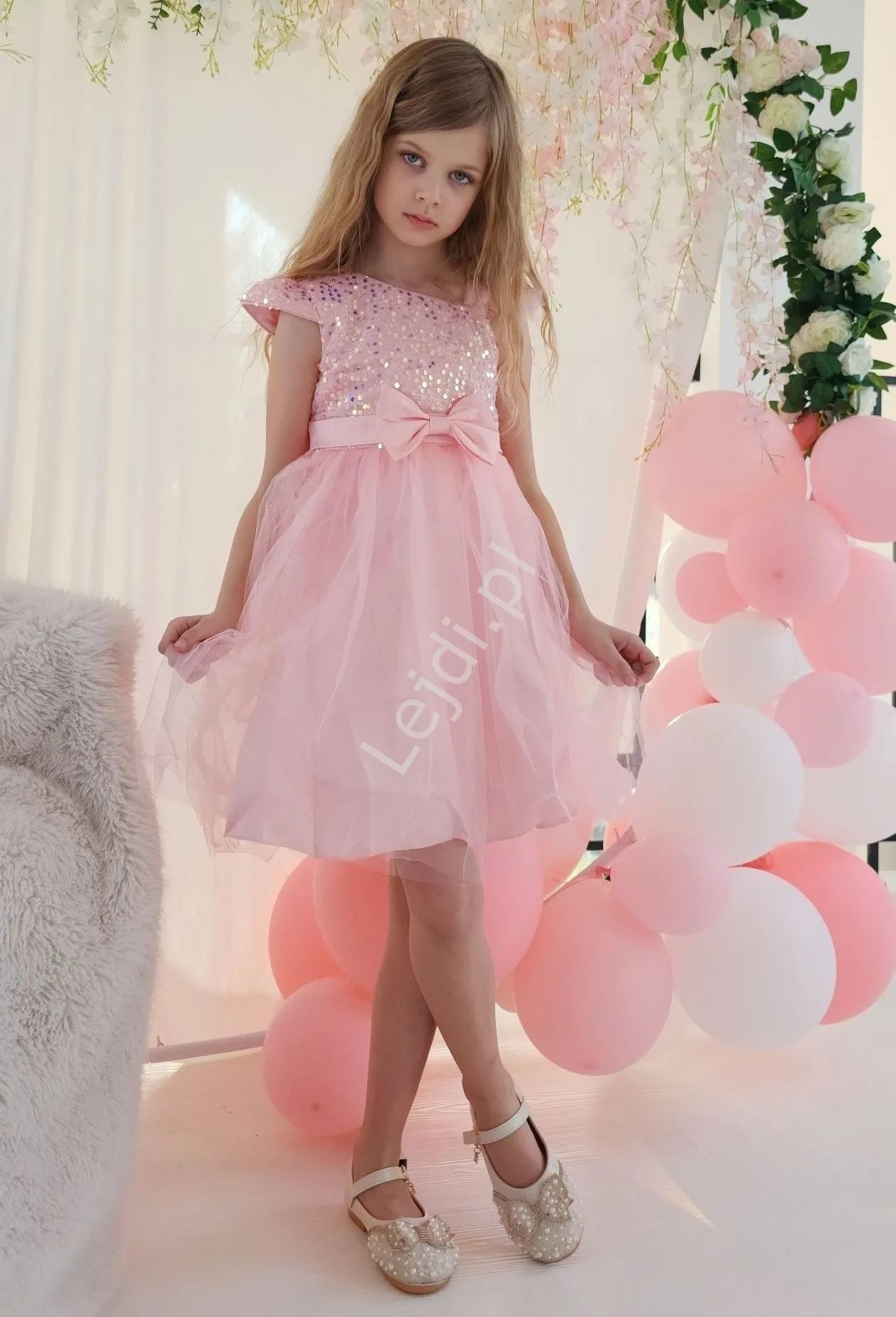 Krótka jasno różowa sukienka wieczorowa dla dziewczynki z cekinami na jednym ramieniu 132