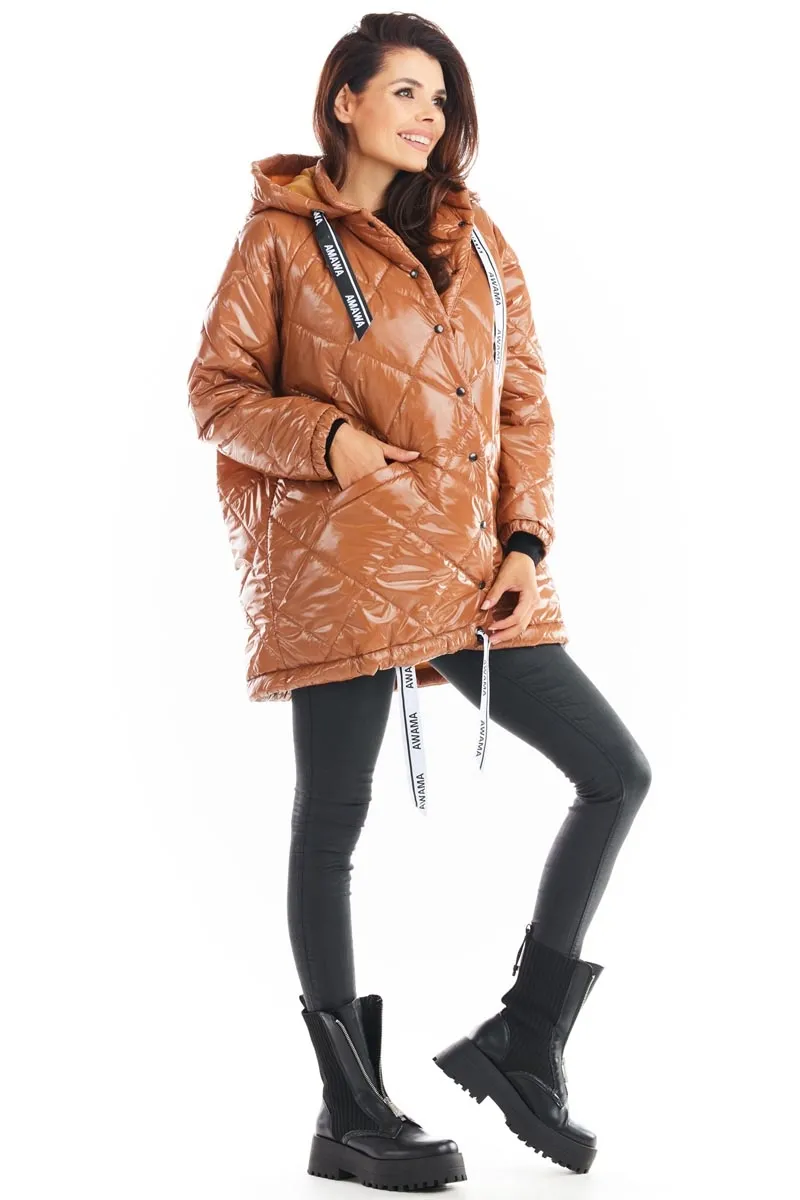 Lakierowana Kurtka Pikowana z Kapturem - Beżowa