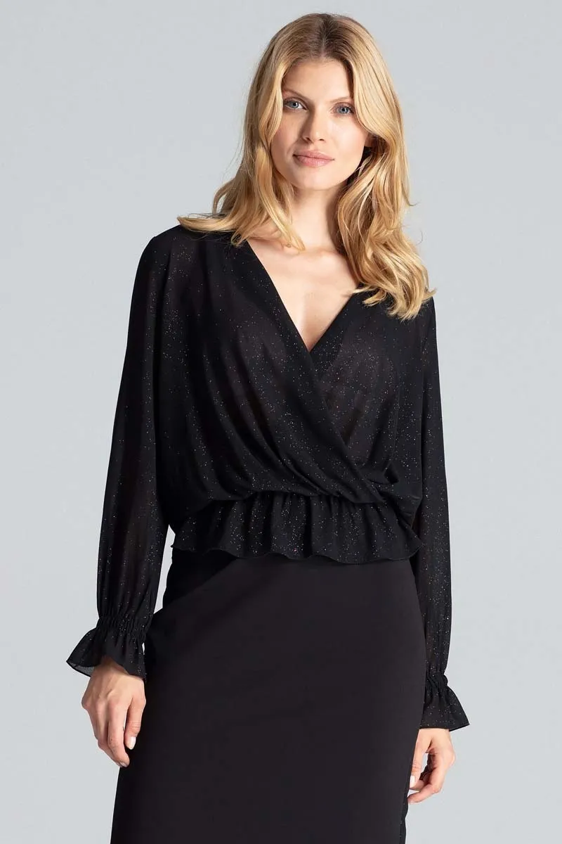 Czarna Połyskująca Bluzka z Kopertowym Dekoltem