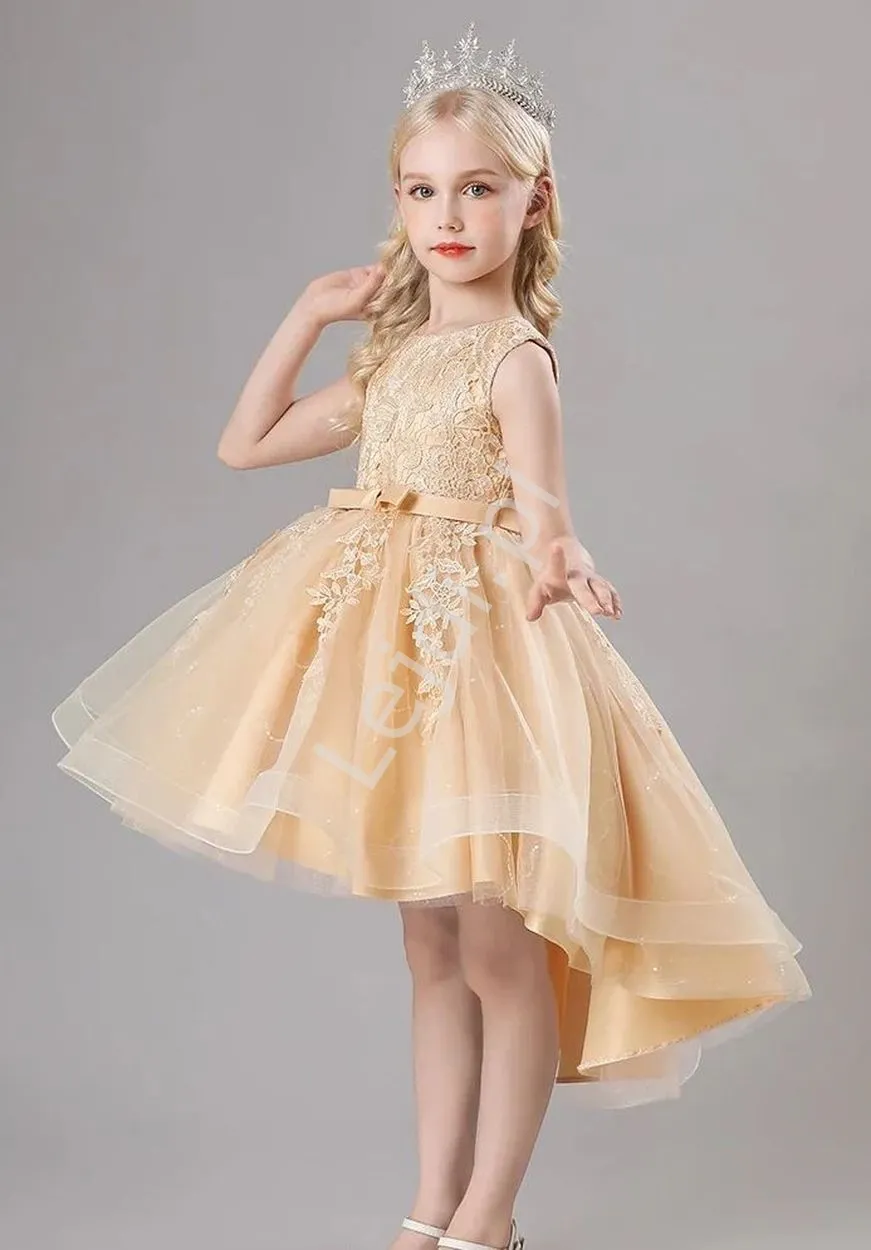Karmelowo złota sukienka z koronką dla dziewczynki z dłuższym tyłem 1243