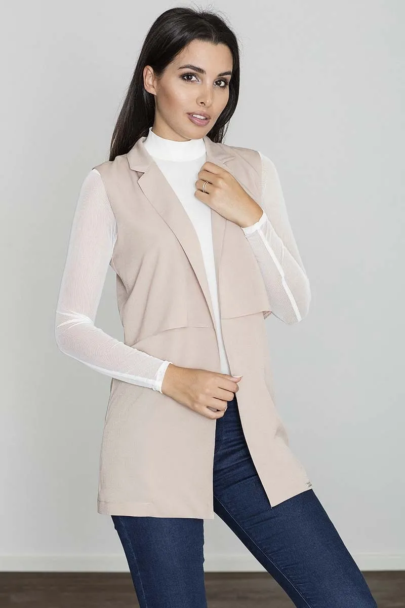 Beżowa Warstwowa Kamizelka bez Zapięcia o Przedłużonym Kroju