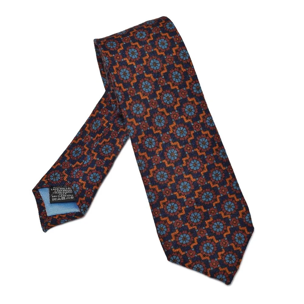 Czerwony wełniany krawat J.Ploenes w błękitny wzór Czerwony wełniany krawat będzie pasował do jesiennych i zimowych marynarek. Krawat ma granatowy, błękitny i szary wzór. Krawat jest mięsisty i miękki, ma wypełnienie wełniane z bawełną. Materiał: Miękka wełna 100% Szerokość krawata: 7,5 cm