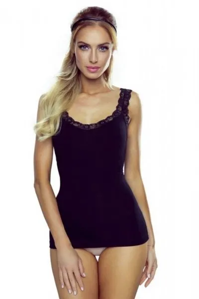 Koszulka damska z wysokiej jakości wiskozy, na wąskich ramiączkach. Dekolt zdobi efektowna koronka z zapięciem ozdobionym cyrkoniami.Tył z ozdobnymi paseczkami.Skład: 80% wiskoza, 15% poliamid, 5% elastan…