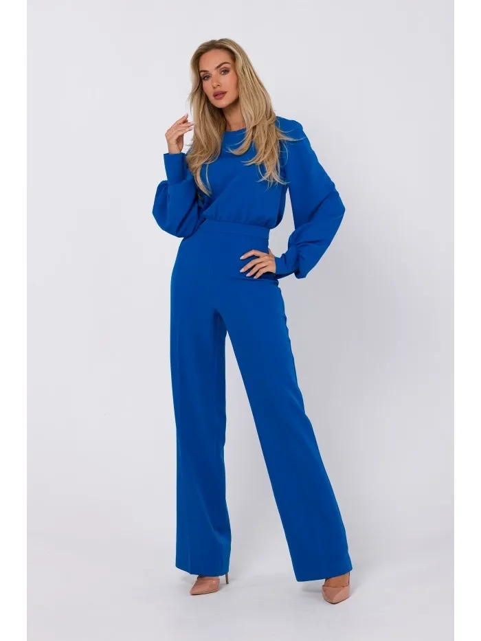 Ten kombinezon w kolorze niebieskim to wyraz elegancji i komfortu, stworzony z myślą o kobietach, które pragną wyjątkowej stylizacji. Wykonany z wysokiej jakości tkaniny, ten kombinezon jest połączeniem klasycznego wzornictwa z nowoczesnym designem. Bufiaste rękawy z mankietami, zapinanymi na dwa oblekane guziki, nadają kombinezonowi unikalny, modny charakter, podkreślając jednocześnie elegancję całej stylizacji. Okrągły dekolt pod szyję dodaje mu subtelności i kobiecego wdzięku. Z tyłu kombinezon jest zapinany na oblekane guziki i kryty zamek, co zapewnia łatwe zakładanie i zdejmowanie, jednocześnie zachowując elegancki wygląd. Długie nogawki z kantem, poszerzanym ku dołowi, dodają lekkości i swobody ruchom, co sprawia, że kombinezon jest idealny na wiele okazji. Bez podszewki, ten kombinezon jest lekki i przewiewny, zapewniając komfort noszenia przez cały dzień. Zaprojektowany i uszyty z dbałością o każdy detal w Polsce, nasz kombinezon to połączenie lokalnej produkcji z najwyższą jakością wykonania.