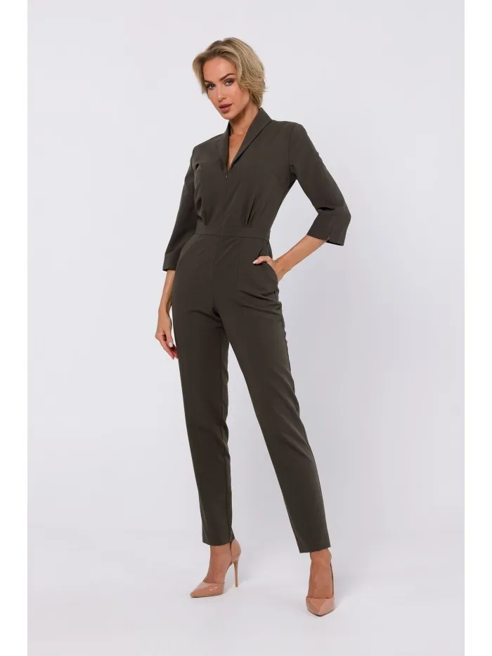 Damski kombinezon zszalowym kołnierzem - khaki - Rozmiar: M