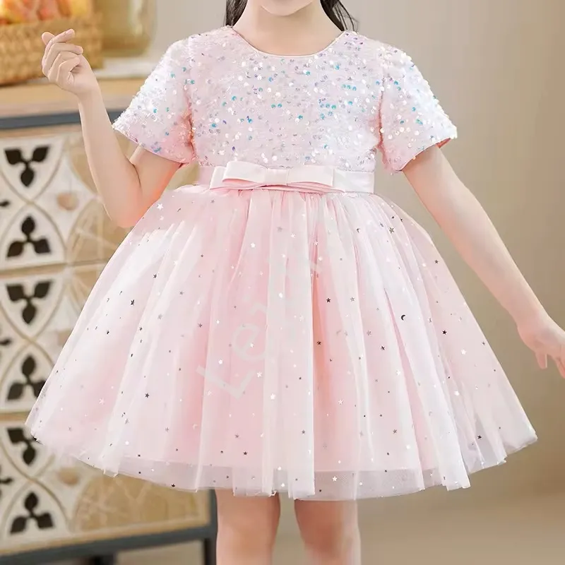 Długa elegancka sukienka wieczorowa dla dziewczynki z cekinami i gwiazdkami szara 6632