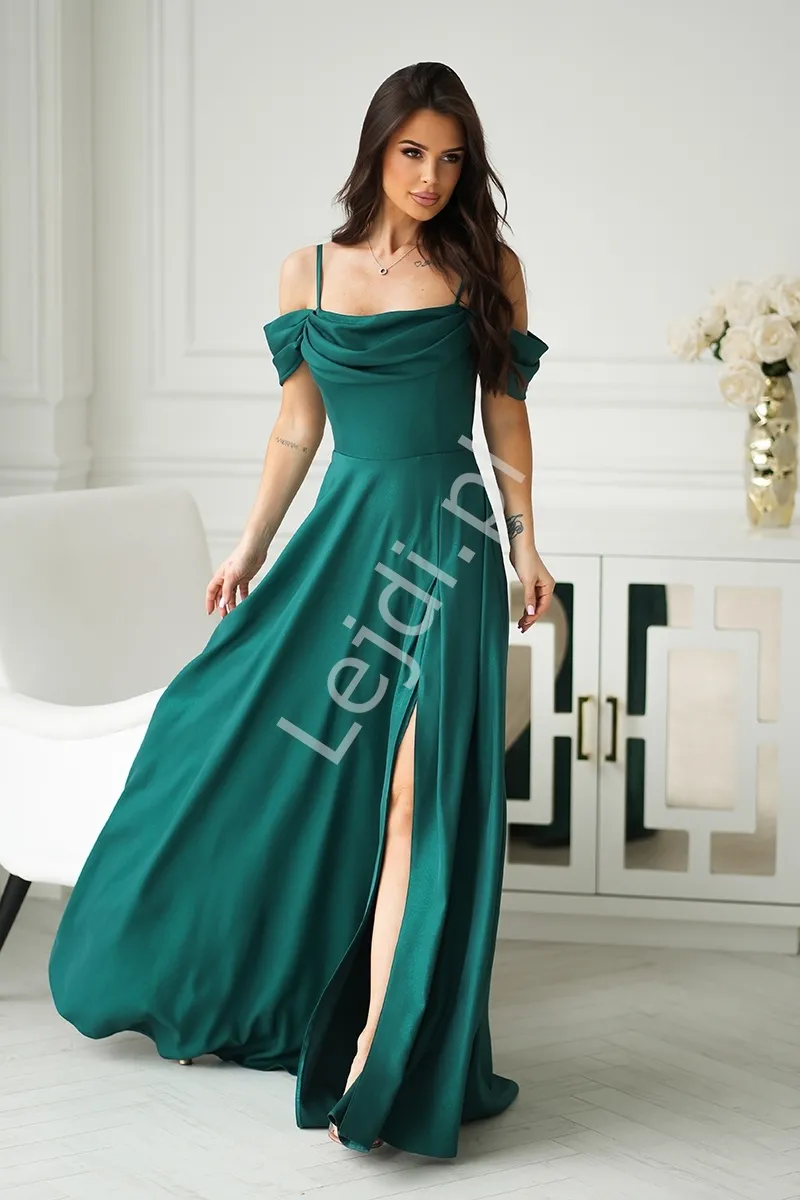 Zielona długa połyskliwa suknia wieczorowa z rozporkiem na nodze hb330